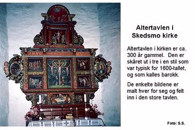 Den store altertavla i tre er fra 1693. Den er skåret av Christopher Ridder og antagelig malt av Peder Andersen Lillie. Illustrasjonene er kopi etter et nederlandsk stikk, og de framstiller Jesu lidelseshistorie. Ett bilde er av nattverden på skjærtorsdag og det store i midten av korsfestelsen, og øverst er det et bilde av oppstandelsen. Hele påskebudskapet er gjengitt på alteret, og dette budskapet er, som sikkert alle vet, det sentrale i den kristne tro. Ytterst på altertavla er det et bilde på hver side. Til venstre ser vi kristne martyrer og til høyre Jesu gjenkomst. Disse bildene gir uttrykk for de kristnes kamp og seier. Hvert bilde kan tas ut av altertavla. Det er treklemmer som holder bildene på plass, og dette forteller en del om hvordan de ble laget.
