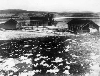 | Tunet på Kjeller gård i 1913. Utsikt over området der flyplassen ble lagt. Foto: Museene i Akershus (1913).