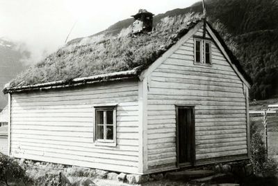Klakeg, Jølster, Sogn og Fjordane. Kvitt lite skulehus med torv på taket. Registrering utført 1958-59 av Johan Schiong for Noregs Lærarlag.