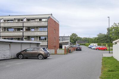 Blokkbebyggelsen langs nordsiden av veien tilhører Dyre Borettslag.