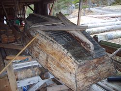 - Ei kokse bygd av Jakob Halsnes frå Halsnesset under Hals på Tustna. Biletet er teke nedmed fjøra nedom Dalan under Hals på Tustna på Nordmøre. Vi ser Innerberg på andre sida av sundet.Foto: Olve Utne