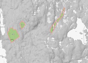Den største teigen, som er på 185 dekar, ligger rett sørøst for Skogsvannet, rundt Pinnemyr og Geveltseterbekken. Det grenser mot flere andre skogstykker: bruksnummer 1, bruksnummer 4 og bruksnummer 9 under Kolbrekk, Olberg og Åsberg under Skar, 93/4,93/9, 93/1 Grandalen under Skibrekk og skog under Dramdal. Den andre teigen, som bare er på 45 dekar ligger drøyt 200 meter lenger øst og grenser også mot Olberg, Kolbrekk (bnr.1) og Dramdal (bnr.3), samt mot Skar (bnr.1). Den tredje skogstykket ligger i området rundt Branestjenn og er på rundt 135 dekar. Det er drøyt 100 meter bredt og strekker seg omtrent 1,2 kilometer i retning sørvest-nordøst. I sørøst grenser det mot Øvrevollen under Gevelt og i nortdvest mot skog under Gevelt, mens det i vest grenser mot Branestjernlia under Skibrekk og i øst mot Seterskogen under Ullern. I dette skogstykket ligger Branestjennsdammen, som er en stein- og torvdam bygd omkring 1790.
