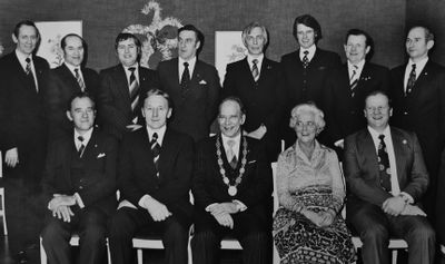 Harstad Formannskap 72-1975. Bak fra v.: Bjarne Ag, Arvid Knutsen, Ivar Hansen, Per kildal, Svein M. Klausen, Andreas Bergland, Asbjørn Johansen, Tom Veierød, Johan Nordvik. – Foran fra v.: Magnus Pettersen, Arnljot Norwich, Marit Schjelderup, Per Jacobsen