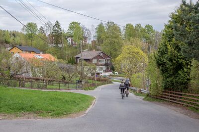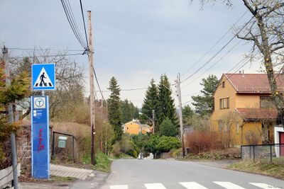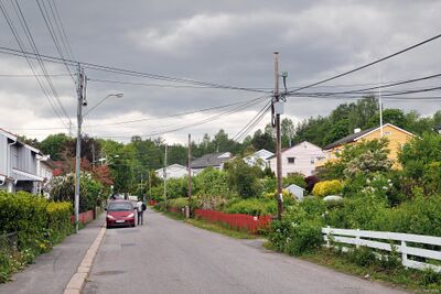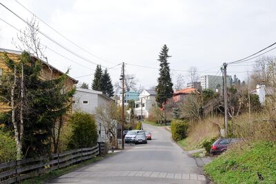 Fra Nordberg, med Kongleveien midt på bildet og Nordberg stasjon på Sognsvannsbanen i høyre hjørne. Særlig plattformen med uværskur retning Oslo sentrum er tydelig på venstre side av linjen.