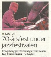 Faksimile, omtale i Laagendalsposten 26. april 2013 av jazz-trommeslageren Jon Christensen, som ble feiret på Jazzfesivalen samme år.
