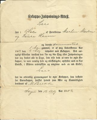 Vaksinasjon ble som nevnt utvikla i 1796, og allerede i 1801 utførte stabskirurg Magnus Andreas Thulstrup den første vaksinasjonen i Christiania. Det er fra koppevaksinen at vi har ordet «vaksine». Jenner brukte kukopper, og navnet på prosedyren kommer fra det latinske ordet for ku, vacca. I begynnelsen brukte man fortsatt smittemateriale fra mennesker i Norge, og legene hadde ofte med seg koppesmittede for å ha tilgang til frisk materie. Først i 1891 ble Det animale vaksineinstitutt oppretta, og de som vaksinerte fikk materie fra dyr levert i plomberte rør.