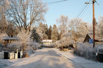 Nordberg kirke ligger som nr. 1 til veien, ellers består bebyggelsen stort sett av villaer og småhus fra 1960-åra.