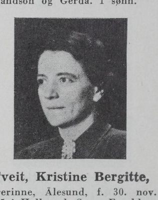 Kristine Bergitte Tveit (født 30. november 1905 i Hyllestad, død 2. september 1985 i Ålesund) var lærer. Hun hadde eksamen ved Volda lærarskule 1929. Senere arbeidet hun som vikar i Bergen, var lærer ved Lærerinne Igland 4-delte skole, Bremanger (1938-46), Hjelmeland 1946, Ålesund fra 1946. Hun var også korleder på fritiden.