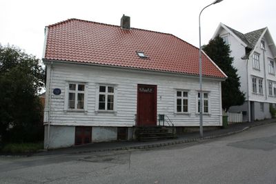 Et kort stykke unna står et hvitt trehus i umiskjennelig 1800-talls sen-empirestil. Huset er forsynt med et blått skilt som forteller at det er under beskyttelse av Byhistorisk Forening i Stavanger.