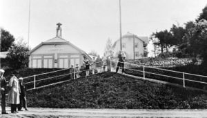 Det gamle sprøytehuset lå ved Bakken (se bildet over). Dette var Brumunddals første brannstasjon. Den ble revet høsten 1960 og ble ironisk nok selv til brensel. Gangstien og det flotte gelenderet er bevart.
