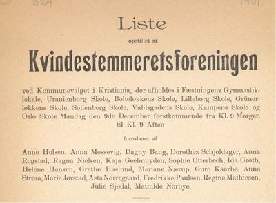 Kvindestemmeretsforeningen stilte egen liste i kommunevalget i Kristiania i 1901, og fikk inn to representanter.