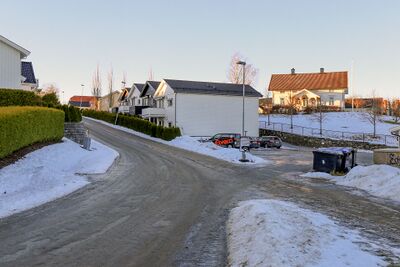 Løvestadveien med våningshuset på det tidligere småbruket Tue i bakgrunnen til høyre.