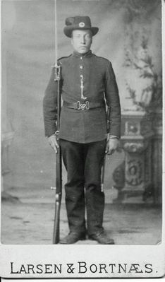 Firmanavnet har vært gjengitt på ulike måter i kildene, men på bildet av den ukjente soldaten til høyre, brukes Larsen & Bortnæs. Slik er det også stavet hos Pynten[1] og Strøm[2] (der siste navn riktignok er stavet Bartnæs i registeret, men Bortnæs i bildeomtalen).