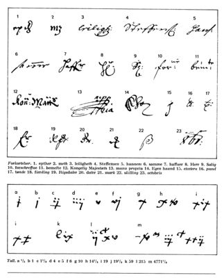 Forkortelser i skrift (abbreviaturer). Deler av middelalderens høyt utviklede forkortelsessystem finnes ennå i skrift fra cirka 1600. Senere opptrer forkortelser mest i faste sammenhenger, ved mynt, mål og vekt, titler og så videre Se illustrasjon. P.Ø.S./K.J.