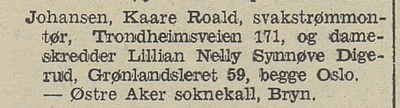 - Lysing for dameskredder Lillian Nelly Synnøve Digerud og svakstrømmontør Kaare Roald Johansen, begge Oslo. Arbeiderbladet, fredag 24. mars 1950, s. 10. Digital versjon på Nettbiblioteket.