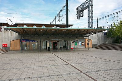 Stasjonsbygningen fra 1934. Til høyre hovedinngangen fra øst til det nye stasjonsanlegget fra 1998.
