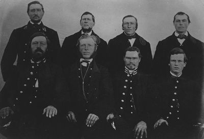 Åtte av de ansatte ved Lillestrøm stasjon i 1865. Sittende fra venstre: stasjonsmester A. Sørlie, formann M. Hagen, overkonduktør A. Nilsen, kontorist M. Sørensen. Stående fra venstre: underkonduktør O. Jensen, portør A. Bredesen, portør G. Johansen og portør Peter Hansen. Bildet er fra Jernbanemuseet på Hamar.