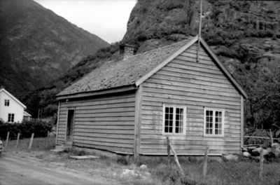 Ljøsne, Lærdal, Sogn og Fjordane, bygd 1866. Lite grått skulehus ved veg og mot fjell. Registrering utført 1958-59 av Johan Schiong for Noregs Lærarlag.