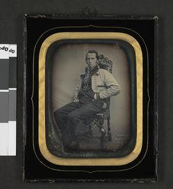 Uke 49 / Veke 49Ukas bildespørsmålHver uke velger vi ut et bilde på Lokalhistoriewiki som vi trenger mer opplysninger om. Som bruker på wikien kan du selv gå inn og tilføye opplysninger på bildesiden – der du også kan finne de opplysningene vi har allerede – eller du kan skrive på bildets diskusjonsside. Her er vi ikke bare ute etter fasitsvar – alle hint er velkomne så vi kan sirkle oss inn mot svaret. «Ung mann i folkedrakt daguerreotypi» ved fotograf Marcus Selmer. Bildet er gammalt — faktisk heilt tilbake til 1857 — og vi veit ikkje kven det er av. Foto: Marcus Selmer, 1857 |