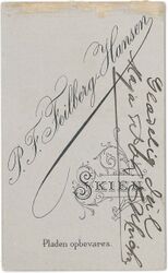 - Jeg tror det står "Maja og Joh. C. Ulrichsen. Maja het Marie Bertine Hansen, bodde i Strandgata 13 A i Larvik og var gift med Johan Christian Ulrichsen. Disse var dronning Sonjas besteforeldre og mine oldeforeldre. Jeg vil gjerne se framsida av bildet, om mulg. Roy Olsen (Rool) (diskusjon) 14. aug. 2017 kl. 03:20 (CEST)
