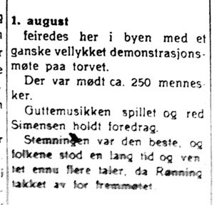 Hva var det man markerte 1. august? Det er nokså åpenbart at dagen har / hadde betydning innen arbeiderbevegelsens revolusjonære fløy. Jeg tror heller ikke at dette kan ha vært et lokalt tilfelle, for hvorfor står det da ingen ting om saken i høyreorganet Harstad Tidende, venstrebladet Haalogaland, og - ei heller i Ap-avisa Folkeviljen?, som alle kom ut i Harstad på denne tida.