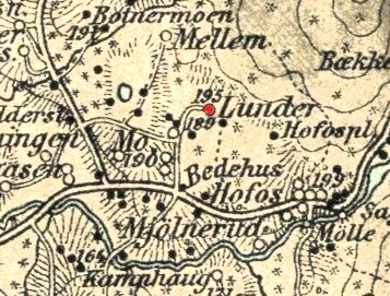 | Lunder (og naboplassen Nordby) på kart fra 1790. Kartverkets historiske arkiv. | |