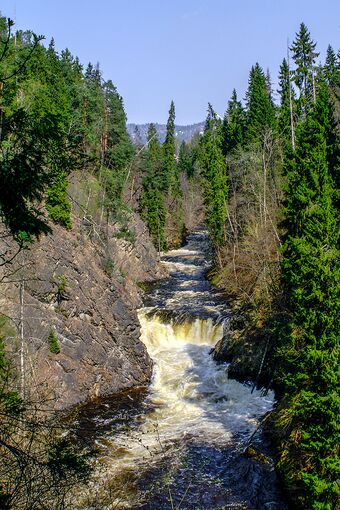 | Røafossen hadde sag som brant i 1764. Røa mølle i fem etasjer fra 1888, brant i 1895, her fossen med Holmenkollåsen i bakgrunnen. Foto: Leif-Harald Ruud (2006).