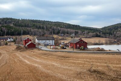 Parti fra den nordvestligste delen av Lyserenveien ved Jaren gård. Vi ser litt av innsjøen Mjær til høyre.