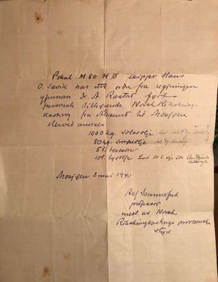 Hans L. Sævik har gått i gamle regnskap og funne ei kvittering frå turen til Tromsø i maidagane i 1940. Kr 5400 er ført som inntekt, og på utgiftsida er det ført kr 800. Her har vore orden i papira, og 80 år seinare fann ein at alt var teke vare på.
