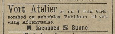 Annonse for «M. Jacobsen & Sunne» i Fredriksstad Tilskuer 22. februar 1873.