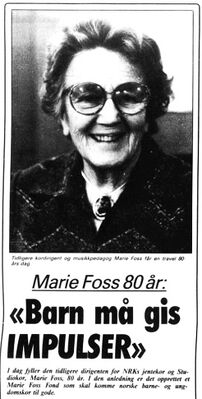 | Hva Marie Foss har betydd for vårt musikkliv, lar seg egentlig vanskelig måle. Vi kan selvsagt måle noen av "produktene" i form av priser og overstrømmende musikkanmeldelser, men det ligger så meget mer i hennes arbeidsinnsats. Jeg tenker på alle de norske solister som hos henne fikk den første inspirasjon og veiledning, på den sangglede hun har skapt hos alle sine sangere, på alle de musikkverker hun inspirerte norske komponister til å skrive, og de store musikkopplevelser hun har gitt sitt publikum. Marie Foss har ganske enkelt gjort en pionerinnsats av uvurderlig betydning for vårt kulturliv. | ||