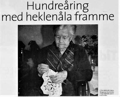 | På Lokalhistoriewiki skriver vi artikler om hundreåringer. Vi oppfordrer historielag og enkeltpersoner til å bli med på denne dugnaden. Vi ønsker både bilder og tekst om personene. Flere artikler og bilder finner du i denne alfabetiske oversikten. |