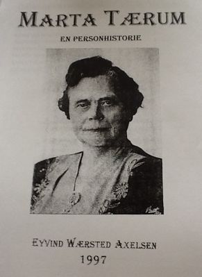 Marta Tærum var min morfars tante. Hun ble født 30.06.1879, i en liten stue på gården Tero. Stua står der den dag i dag, og er nå blitt gjort om til museum med mange minner fra Martas og søsknenes barndom. Hun døde 30.6.1959, på sin 80-års dag. I barndommen bodde hun på gården Tero, som ligger midt mellom Aurlandsvangen og Vassbygdi i Sogn, sammen med 10 søsken. Deres navn var Østina (men alle kalte henne alltid bare Stina), Valborg, Ida, Lukris, Torstein, Atle, Ragnvald, Syvert, Jens og Guttorm. Noen år etter Martas fødsel i 1891, solgte foreldrene gården Tero, og flyttet over fjellet til Østlandet. Der kjøpte de gården Skott, som ligger på Burud i Øvre Eiker.