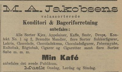 I oktober 1902 kunne det registreres at annonsene fra baker Jakobsen endret karakter, fra nå av het det for eksempel: «M.A. Jakobsens Bageri og Conditoriforretning Harstad anbefales det ærede publikum. Alle sorter finere Kager. Min velassorterede husholdningshandel anbefales. M. A. Jakobsen». Som de fleste handelsfolk vet må man tid om annen endre litt på seg, så også med reklameframstøtene. I august 1903 så man en ny endring: «M.A. Jakobsens Bageri & Konditori samt Husholdningshandel anbefales».