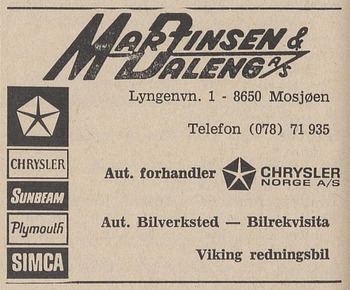 Bilmerkene Simca og Sunbeam ble i 1970 ledige etter Halvdan Vik, som da ble drevet av Lars Vik. Kjell Daleng og Håkon Martinsen hev seg inn i konkurransen for å overta dette attraktive agenturet, og gikk seirende ut da importøren Chrysler Norge valgte Martinsen & Daleng som ny forhandler på Helgeland sør for Korgfjellet.[3] Påfølgende år tok de også over salget av Chrysler da dette merket ble relansert i Europa.[4] I tillegg forhandlet de Plymouth, og andre merker som var eid av Chrysler.[5]