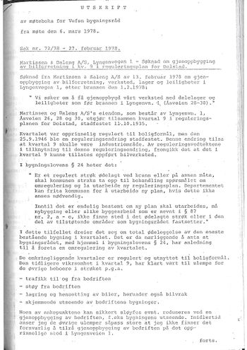 | Vefsn kommunestyre godkjenner bygningsrådets vedtak av 6. mars 1978 i sak nr. 72/78, der bygningsrådet avslår søknad fra fa. Martinsen & Daleng A/S om gjenoppbygging av firmaets anlegg i Lyngenvegen 1 etter brannen 1. februar d.å.