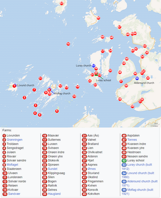 Merk: Koordinatene er omtrentlige. Kartet er delt inn i deler i samsvar med tellingskretser i folketellingen i Norge i 1920. Dette kartet vil inneholde ett gårdsnavn per gårdsnummer; andre gårdsnavn eller underavdelingsnumre kan finnes.