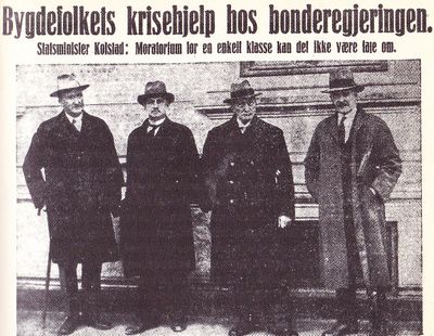 Etter en kort prisstigning i åra mellom 1923 og 1924 sank jordbruksprisene kraftig fra 1926.[31] Jordbruket ble rammet av en særegen priskrise, som varte til midten av 1930-åra. I 1933-34 var landbruksprisene omtrent fjerdeparten av det de hadde vært i 1920. Prisene på produksjonsmidler og forbruksvarer var også redusert, men til dels betydelig mindre. Fra omkring 1930 ble dessuten store deler av landbruket rammet av en omsetningskrise med overproduksjon av husdyrprodukter.[32]