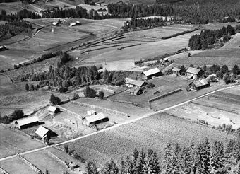| To Moen-plasser. Til venstre Midtre Lystadmoen, til høyre Nordre Lystadmoen. Foto: Widerøe Flyveselskap/Kongsvinger kommune (1957).