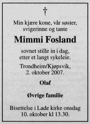 - Mimmi Berg Forslands dødsannonse i Fremover, fredag 05.10.2007. Digital versjon på Nettbiblioteket.