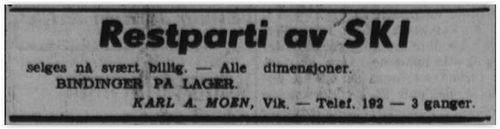 I 1957 annonserer Carsten Moens Skifabrikk, Vik, sine tjenester for reparasjon av ski. Han har også "en del feilski" til salgs ekstra billig.[5]