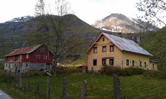 | Mosevollen sett frå vegen med dei karakteristiske gjerdestolpane i stein | |