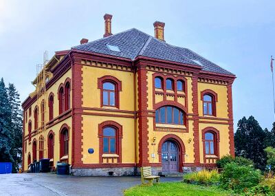 Bygningen er i pusset teglstein i to fulle etasjer med valmtak tekket med skifer. Den har et stiluttrykk i historisme som særlig uttrykkes i dekorelementene. Den har rikt utformede fasader med risalitter (partier av fasaden som springer fram), horisontale elementer som vannbord, etasjegesims og takgesims. De vertikale hjørnemarkeringene har kvadersteinsutforming. Vinduer og vindusomramming er øverst avsluttet i rundbue.