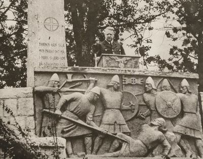 Monumentet ble tegnet av Wilhelm Rasmussen, som selv var medlem i Nasjonal Samling. Kunstneren er også kjent for statuer av Frederik II i Fredrikstad og av Olav Tryggvasson på Torget i Trondheim, og for Eidsvollsmonumentet som står i Bøverdalen.