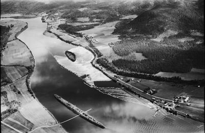 | Namsen gjennom Ranem i Overhalla. Ranem kirke midt på bildet langs elva. Foto: Vilhelm Skappel/Widerøes Flyveselskap (1956).