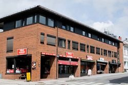 | 11 | Opprinnelig hus er revet. Eiendommen inngår nå i komplekset Kvartal 13 (Byterassen). Her åpnet Joh. Carlsens «Finere colonialforretning og skibshandel» i 1881. Overtatt av Andr. W. Lund og drevet som «Joh. Carlsens Eftf.». | |