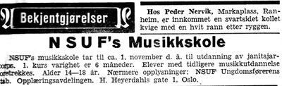 NSUF etablerte egen musikkskole i Oslo - blant annet for å sikre rekrutteringen til janitsjarorkestre. Interesserte søkere ble bedt om å henvende seg til «Ungdomsførerens stab» i Hieronymus Heyerdahls gate 1.