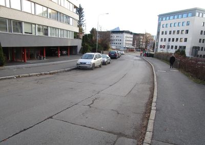 Motiv fra Nedre Skøyen vei i Oslo. Lilleakerbanen krysser veien bakerst i bildet.