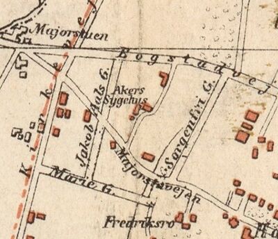 Aker Sygehus ble drevet her fra 1871 og ved folketellingen i 1875 er eiendommen bebodd av sykehusets økonom, det vel si administrative leder, med hustru, to tjenestejenter og en tjenestegutt, samt 36 fattiglemmer, 22 forsørget av Akers fattigkasse, fire fra Christiania, men også av andre kommuners fattigkasser. En forsørget seg selv, og en ble forsørget av statskassen, de resterende fra kommuner på indre Østlandet.