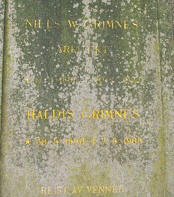 | Arkitekt Niels Grimnes’ bisættelse foregik i Krematoriet lille julaften under megen deltagelse. I Krematoriet, som var smykket med palmer og laurbærtrær, saaes flere af hovedstadens arkitekter, studiekamerater fra Trondhjems tekniske læreanstalt og mange av den unge arkitekts øvrige venner. … Arkitekt Grimnes gik saa altfor tidlig bort, midt i sine bedste arbeidsaar, med varm interesse for arbeidet, begeistret for hver blyantstreg og hver plan, som han skulde bringe noget skjønt du af. | ||